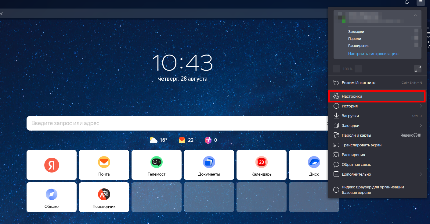 2. Кликнуть на значёк настроек в правом верхнем углу и выбрать «Параметры»