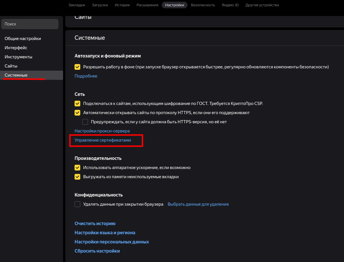 2. Перейти в раздел Системные и выбрать "Управление сертификатами"