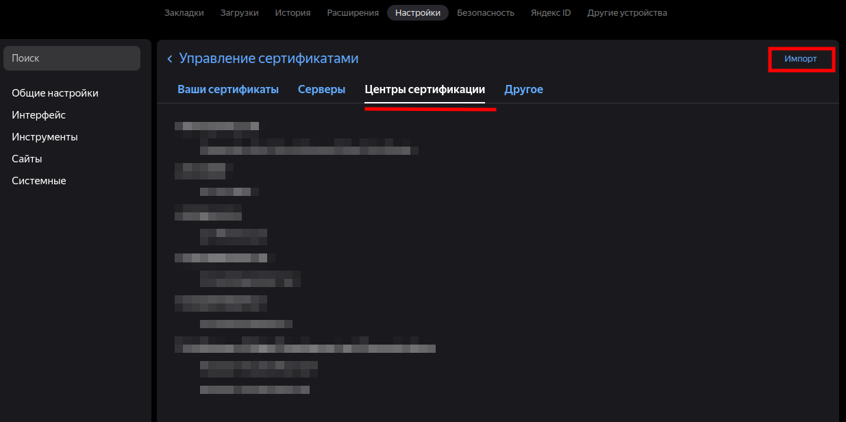 1. Перейти в меню Настройки -> Конфиденциальность и безопасность -> Безопасность -> Настроить сертификаты и перейnb на вкладку Центры сертификации.