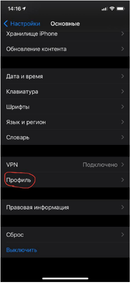 Примечание: «Зависимости от версии iOS пункт “Профиль” будет находиться в “VPN и управление устройством”»