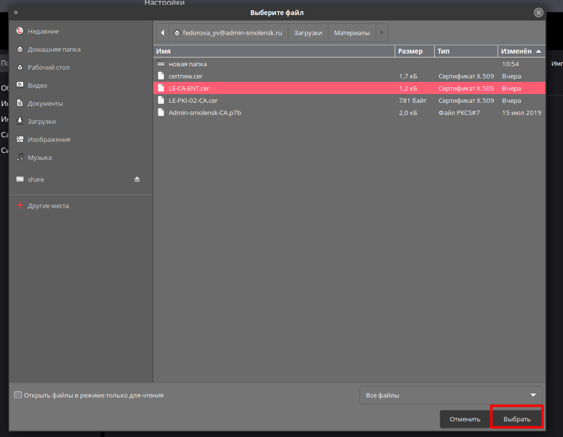 4. В появившемся диалоговом окне выбрать предоставленный корневой сертификат и нажать «Открыть». Корневой сертификат должен быть предварительно загружен.