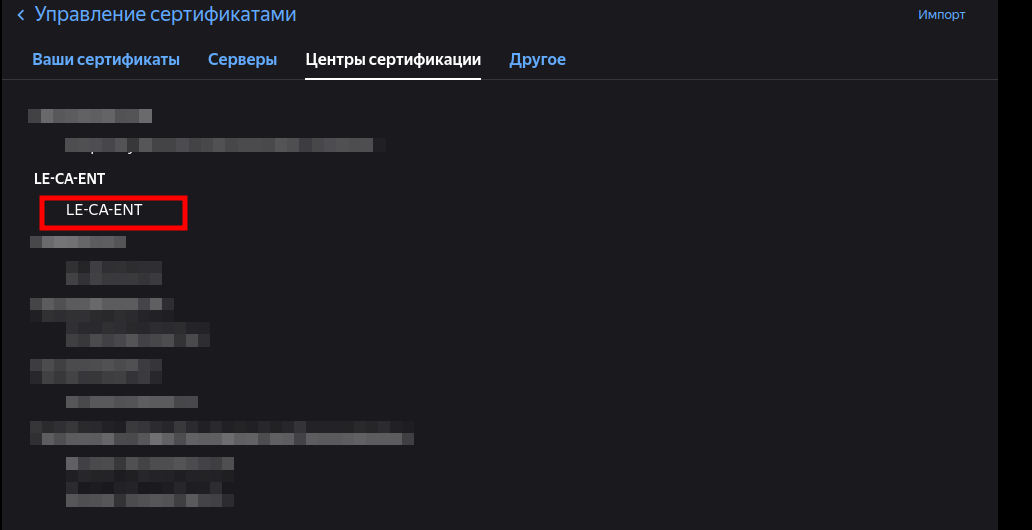 2. Добавить необходимый сертификат или цепочку сертификатов с помощью кнопки Импорт.